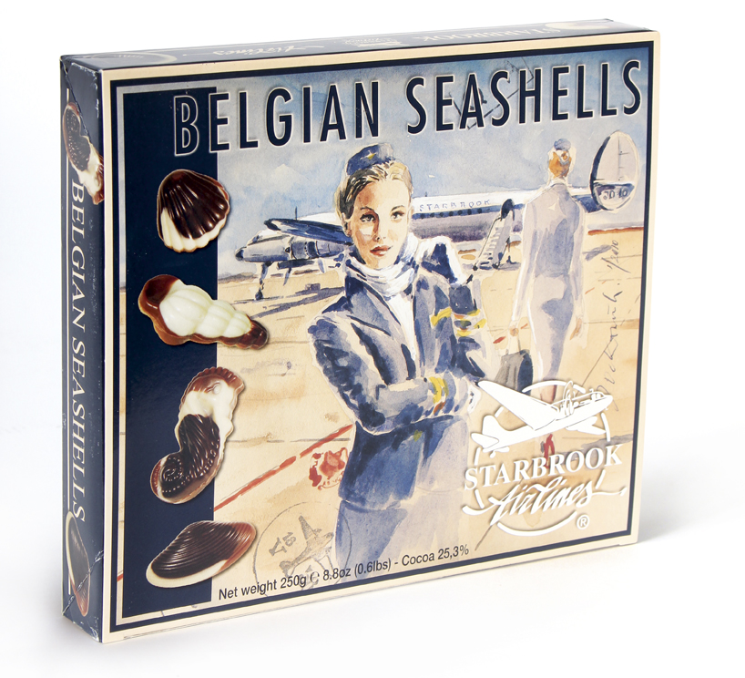 In a retro style, stewardesses, pilots and airplanes evoke the style of the early 50’s aviation era. All the packaging design developed by Jaak De Koninck in a creative aquarelle style is outstanding and totally different from what the traditional, somewhat conservative chocolate market is actually supplying. Such creative and innovative packaging deserves the highest quality Belgian chocolate and vice versa!